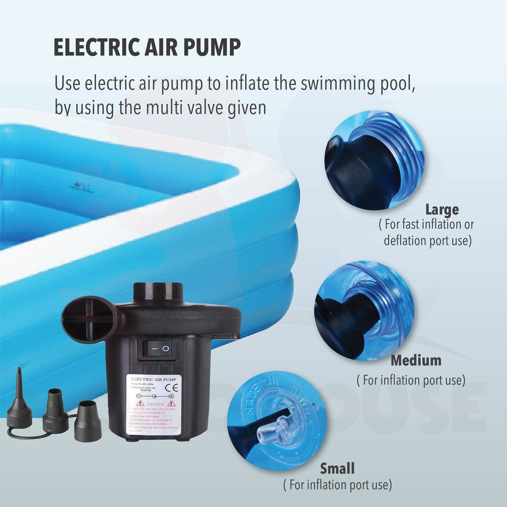 Firstly, use the electric pump to inflate the swimming pool by using the multi valve given.